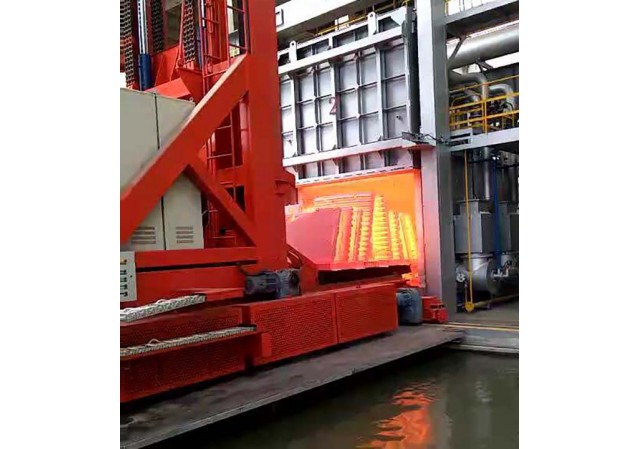 生產(chǎn)線配有一臺(tái)快速下水(油)淬火操作車,該操作車可上下、左右、前后六個(gè)方向移動(dòng)。工件熱處理完成后,操作車迅速進(jìn)入爐內(nèi)將工件從爐膛內(nèi)叉出,并快速落入水池或淬火液池內(nèi),整個(gè)轉(zhuǎn)移過程可控制在30秒內(nèi)完成。